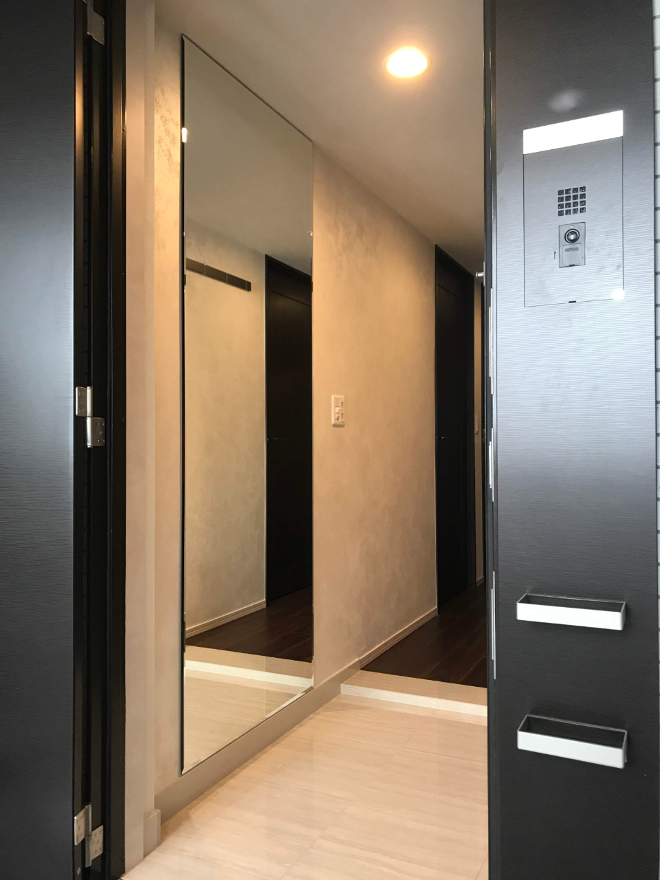 玄関の姿見鏡に大きな鏡をつけると明るくなり空間の広がりもでます。